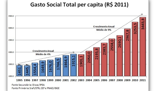 Em paralelo à consolidação fiscal, os governos dos presidentes Lula e Dilma promoveram ampliação dos gastos na área social. A área social engloba: educação, previdência, seguro desemprego, saúde, assistência social etc. O investimento social per capita cresceu 32% em termos reais entre 1995 e 2002. De 2003 a 2010, cresceu mais que 70%. Cabe ser destacado que mesmo diante da fase mais aguda da crise financeira internacional de 2008-9 os investimentos sociais não foram contidos – a partir de 2009, houve inclusive uma injeção adicional de recursos nessa área.